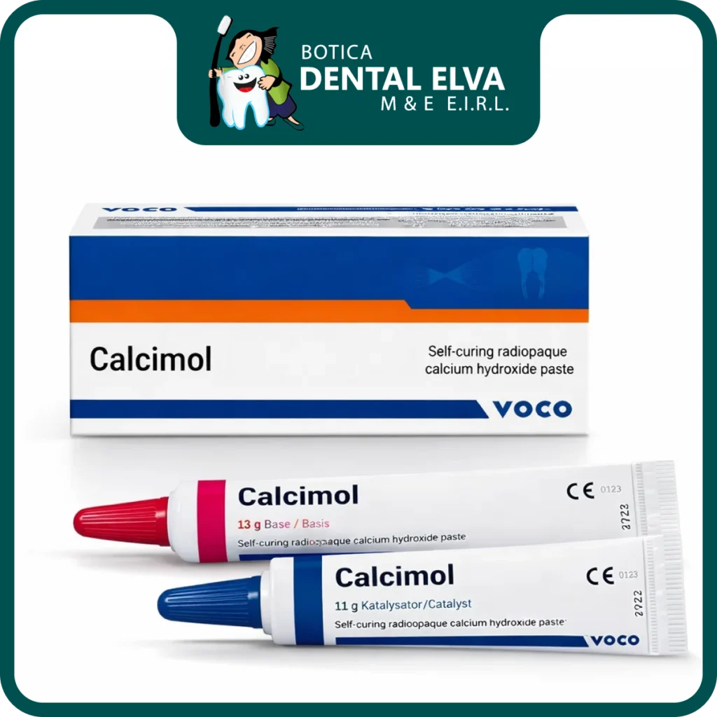 Calcimol (VOCO) es una pasta de hidróxido de calcio autopolimerizable y radiopaca, indicada como protección pulpar indirecta y como liner/base bajo materiales de obturación, con mezcla pasta-pasta (base + catalizador) para aplicación clínica controlada.