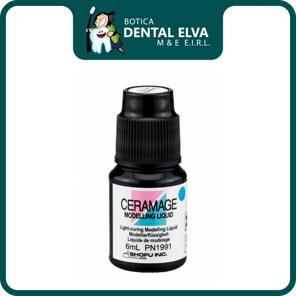 El Ceramage Modelling Liquid de la reconocida marca Shofu es un líquido modelador formulado específicamente para optimizar la manipulación y el esculpido de resinas compuestas de laboratorio (indirectas) durante la confección de coronas, puentes y carillas. Este agente humectante evita que el composite se adhiera a las espátulas y pinceles, permitiendo al técnico dental lograr una anatomía precisa, márgenes nítidos y una estratificación fluida sin incorporar burbujas de aire en la masa de resina.