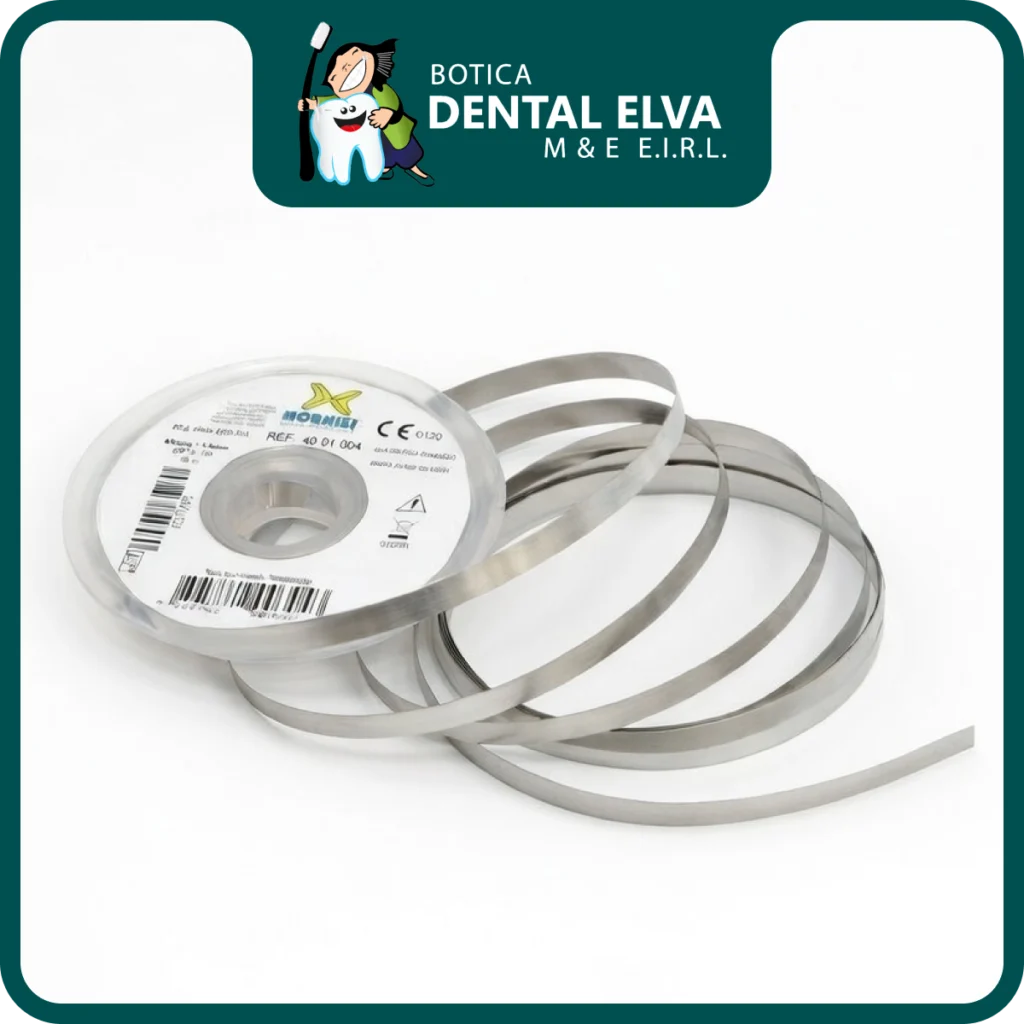 Fabricada en acero inoxidable de grado médico, esta cinta combina la maleabilidad exacta para ser contorneada alrededor de la corona dental con la rigidez estructural necesaria para soportar las fuerzas masticatorias y biomecánicas del tratamiento. Es el material de elección para la elaboración de aparatología fija soldada, como mantenedores de espacio, disyuntores palatinos (Hyrax, Hass), arcos linguales y botones de Nance. Su presentación en un práctico rollo continuo permite cortar la longitud exacta requerida, optimizando al máximo el uso del material sin desperdicios.