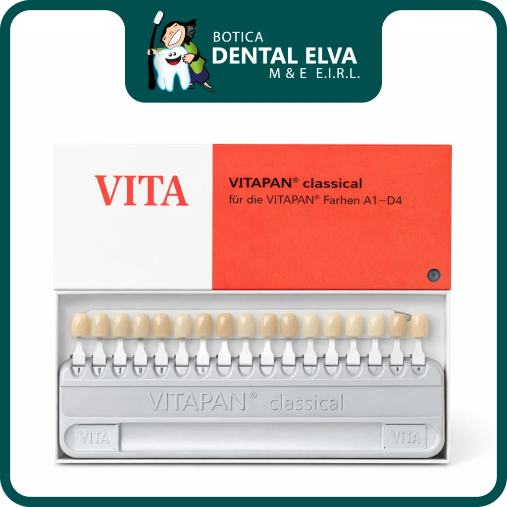 El Colorímetro Vitapan Classical es una guía de tonos estándar para seleccionar el color dental de forma rápida y consistente en clínica. Ideal para restauraciones estéticas y trabajos con laboratorio, ayudando a mejorar la concordancia de color y reducir correcciones.