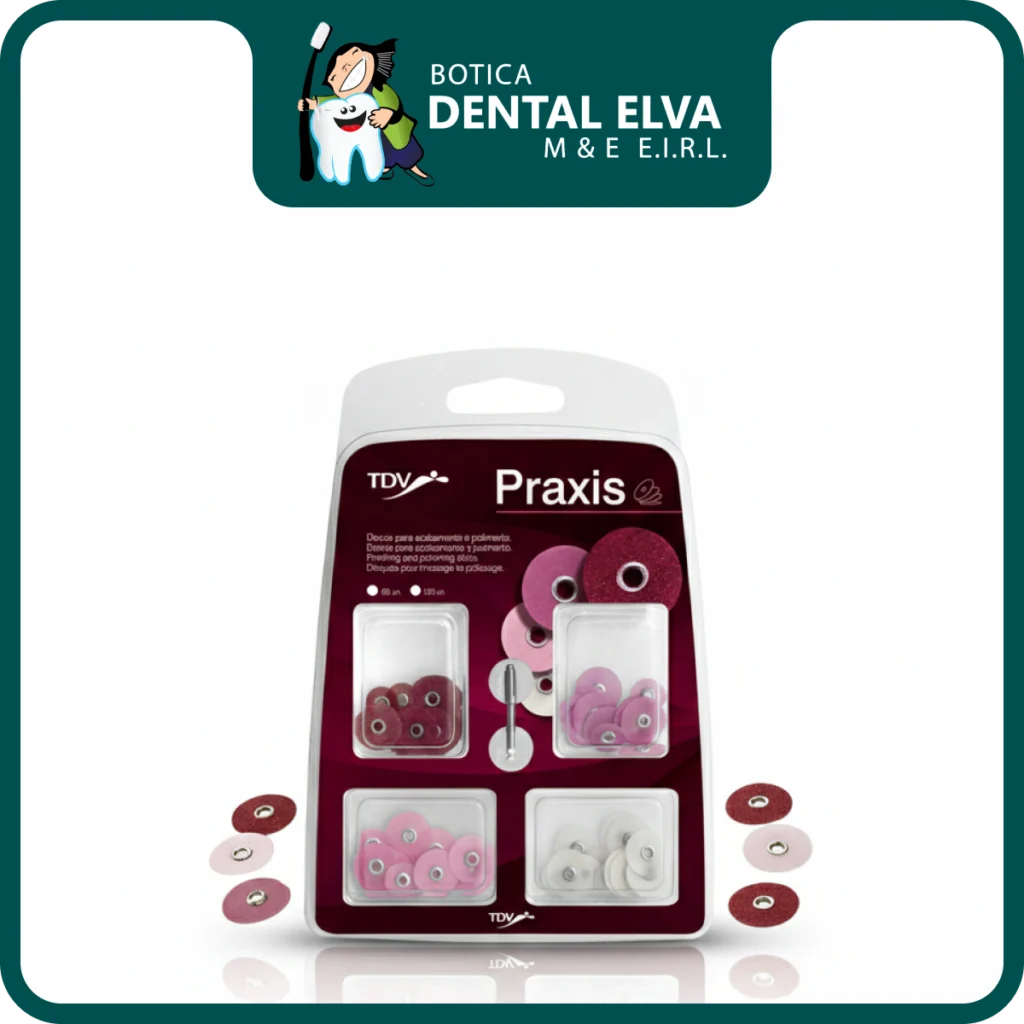 Los Discos Praxis de TDV son un sistema integral de acabado y pulido diseñado para restauraciones estéticas, especialmente resinas compuestas y ionómeros de vidrio. Su característica distintiva es el centro metálico reforzado que se acopla a un mandril de presión especial. Este diseño «Pop-On» no solo garantiza una sujeción firme que evita que el disco salte durante la rotación, sino que permite una inversión instantánea del disco: el odontólogo puede usar la cara abrasiva hacia arriba o hacia abajo sin cambiar de instrumento, facilitando el acceso a caras mesiales, distales, vestibulares o palatinas con un solo movimiento.