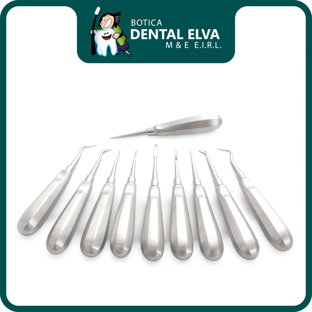 Kit de elevadores dentales x 10 diseñado para procedimientos de exodoncia y cirugía oral, ideal para facilitar la luxación dental y la separación controlada de tejidos con precisión. Incluye diferentes formas y ángulos para adaptarse a múltiples técnicas clínicas, brindando agarre firme, control y eficiencia en el trabajo odontológico.
