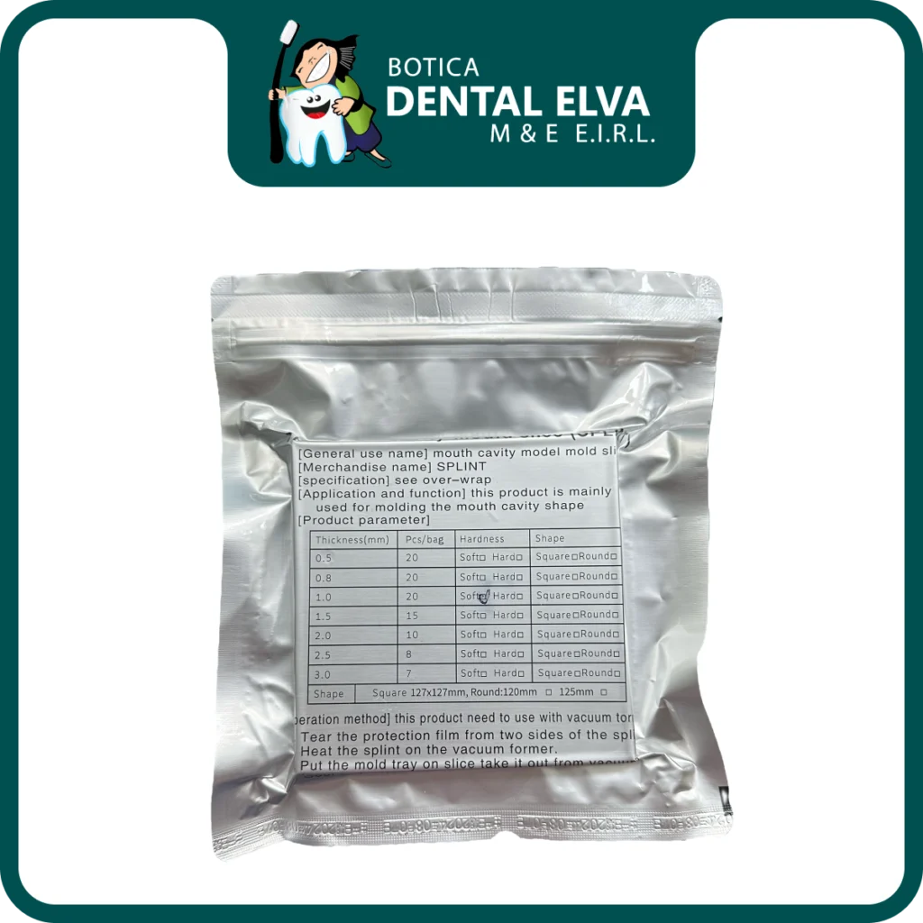 Fabricadas con polímeros de excelente transparencia (Crystal Clear), estas placas garantizan una estética superior y una adaptación precisa al modelo de yeso. Su comportamiento térmico es estable, permitiendo un calentamiento uniforme que evita la formación de burbujas (siempre que se almacenen correctamente) y asegura un copiado fiel de los detalles anatómicos y márgenes gingivales, proporcionando una retención óptima sin distorsiones post-enfriamiento.