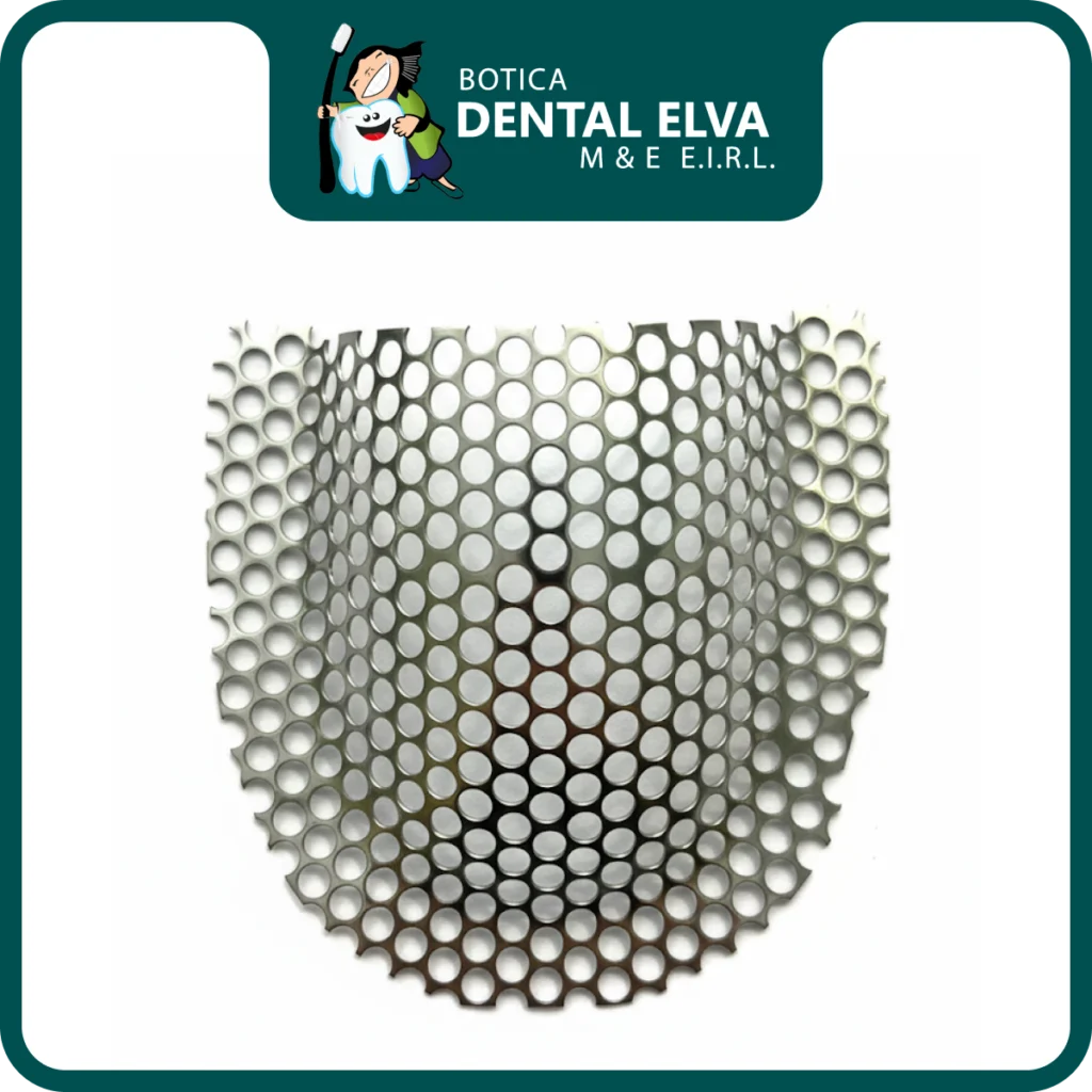 Su diseño reticulado (perforado) permite que el acrílico fluya y envuelva completamente el metal, garantizando una retención mecánica inseparable entre la malla y la base protésica. Además, viene anatómicamente contorneada para adaptarse al paladar (superior) o al reborde alveolar (inferior), y su perfil delgado asegura que no interfiera con la estética ni ocupe espacio vital para la lengua del paciente.
