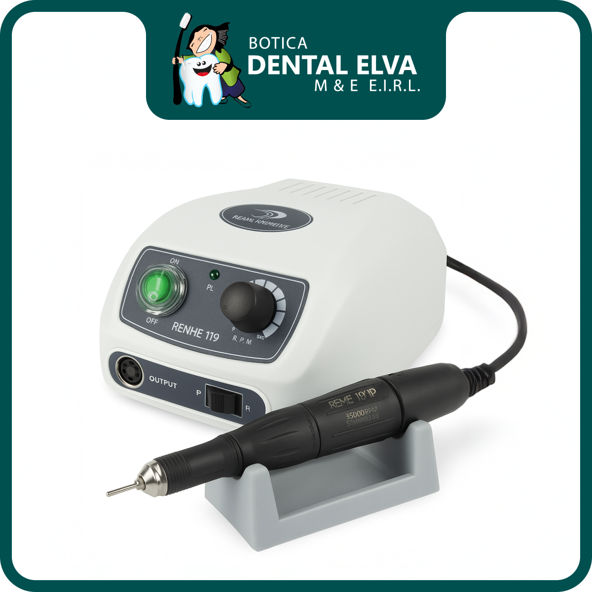 Micromotor eléctrico Renhe 119 diseñado para uso en laboratorio dental. Equipado con pieza de mano recta tipo U, ideal para procesos de fresado, desbaste y ajuste de estructuras protésicas. Ofrece un funcionamiento silencioso, alta potencia y control preciso de velocidad, mejorando la eficiencia en el trabajo técnico dental.