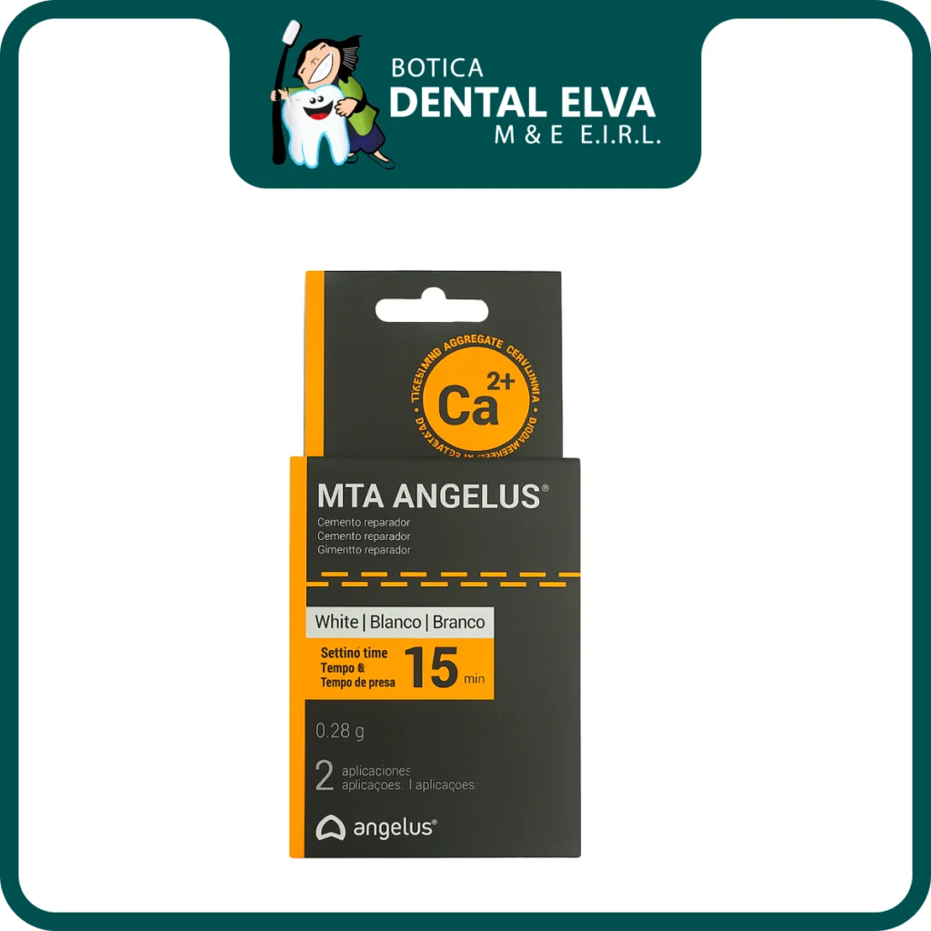 El MTA Angelus es un cemento endodóntico biocerámico indicado para el sellado de perforaciones radiculares, recubrimiento pulpar y obturación retrógrada. Su composición hidrofílica y partículas minerales permiten un sellado marginal efectivo incluso en ambientes húmedos.