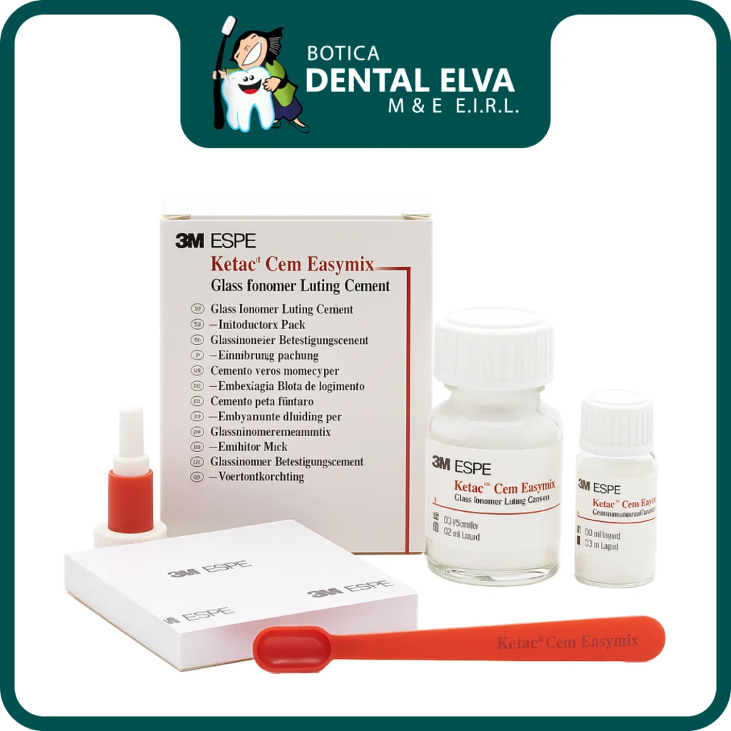 Ketac Cem Easy Mix (3M/Solventum) es un cemento de ionómero de vidrio para cementación definitiva, diseñado para crear una unión química con esmalte y dentina y ofrecer radiopacidad para control clínico. Su formulación busca facilitar la mezcla y mantener un grosor de película muy bajo, ayudando al asentamiento de restauraciones y a la integridad marginal en cementación convencional.