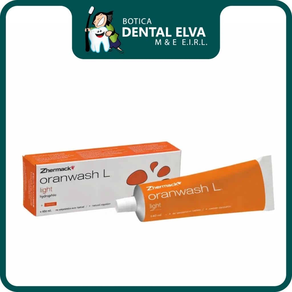 Oranwash L es un material de impresión elastomérico a base de silicona por adición (polivinilsiloxano) formulado con baja viscosidad para el registro detallado de estructuras dentarias. Su fluidez favorece la penetración en zonas críticas como márgenes de preparación, surcos y áreas interproximales.