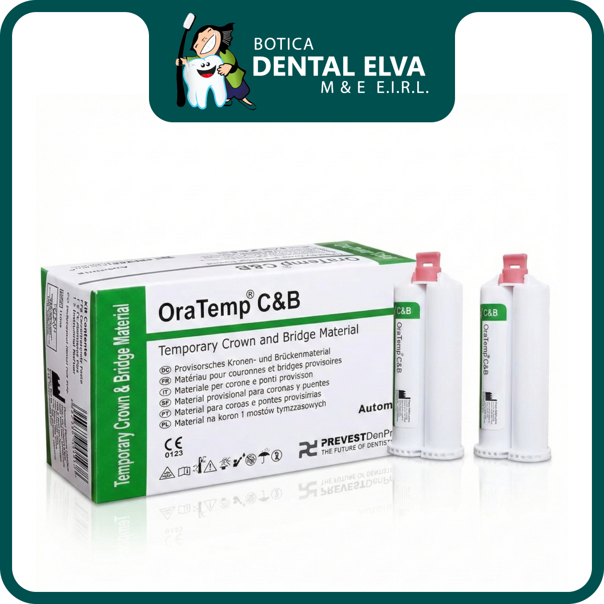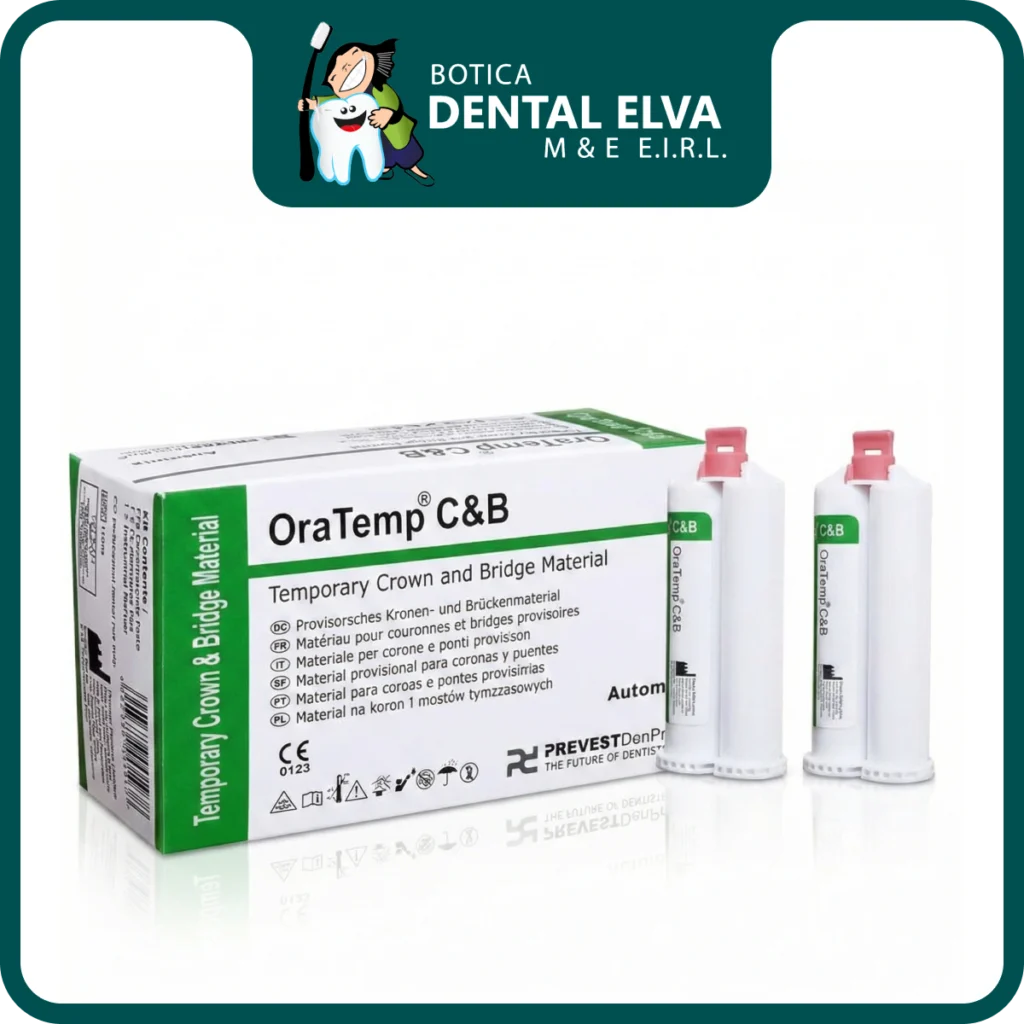 Oratemp C&B es un material compuesto autocurable a base de ésteres de metacrilato multifuncionales (resina bis-acrílica), diseñado para la fabricación rápida y precisa de restauraciones provisionales en clínica. Su sistema de dos componentes ofrece propiedades físicas similares a los materiales de obturación definitivos, destacando por su excelente resistencia a la compresión (300 MPa) y a la flexión, lo que garantiza provisionales duraderos incluso en puentes de tramo largo.