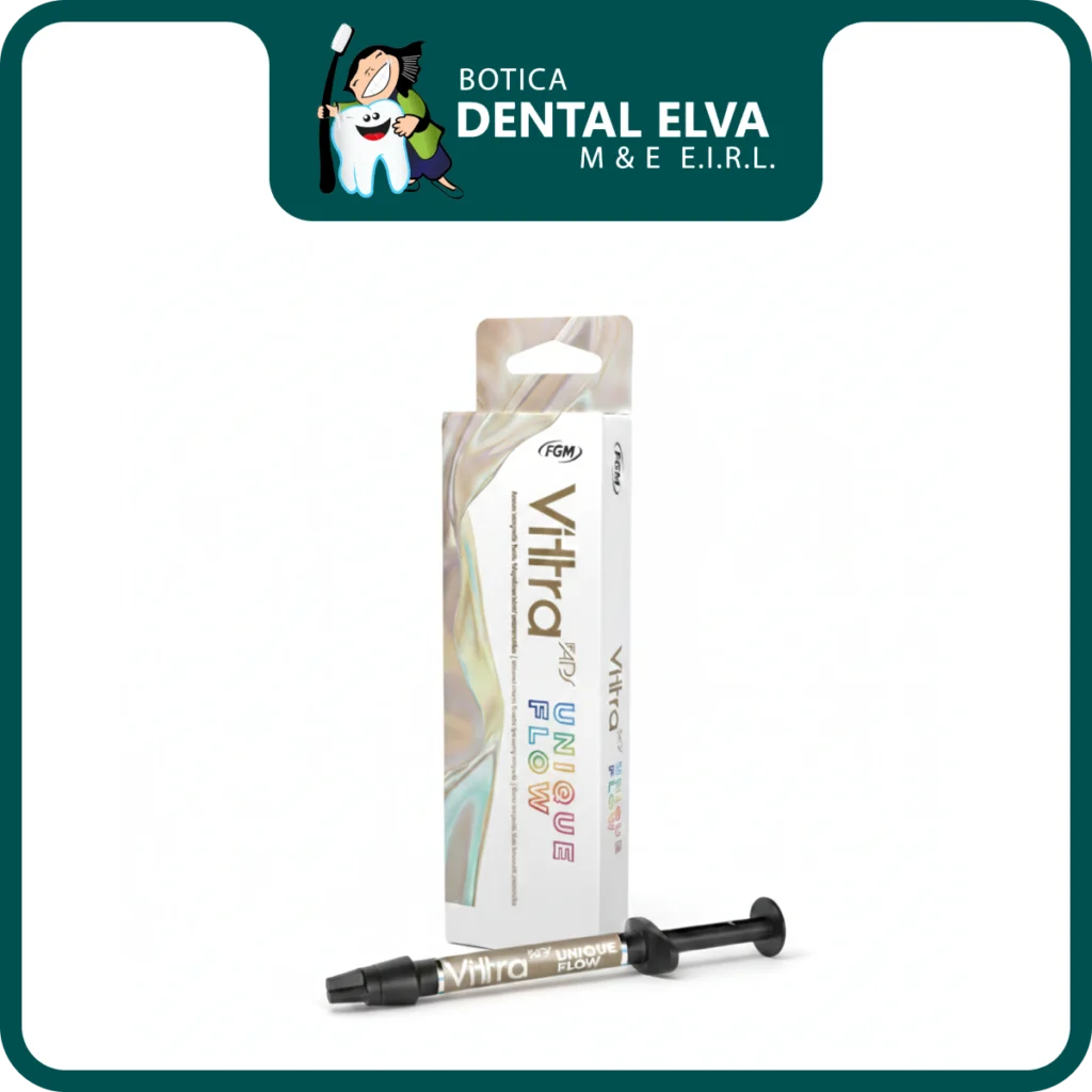 Vittra APS Unique Flow de FGM. Resina fluida con efecto camaleón que cubre todos los tonos (Bleach a A4). Tecnología APS y libre de BPA. Ideal para base/liner, sellado y cavidades pequeñas.